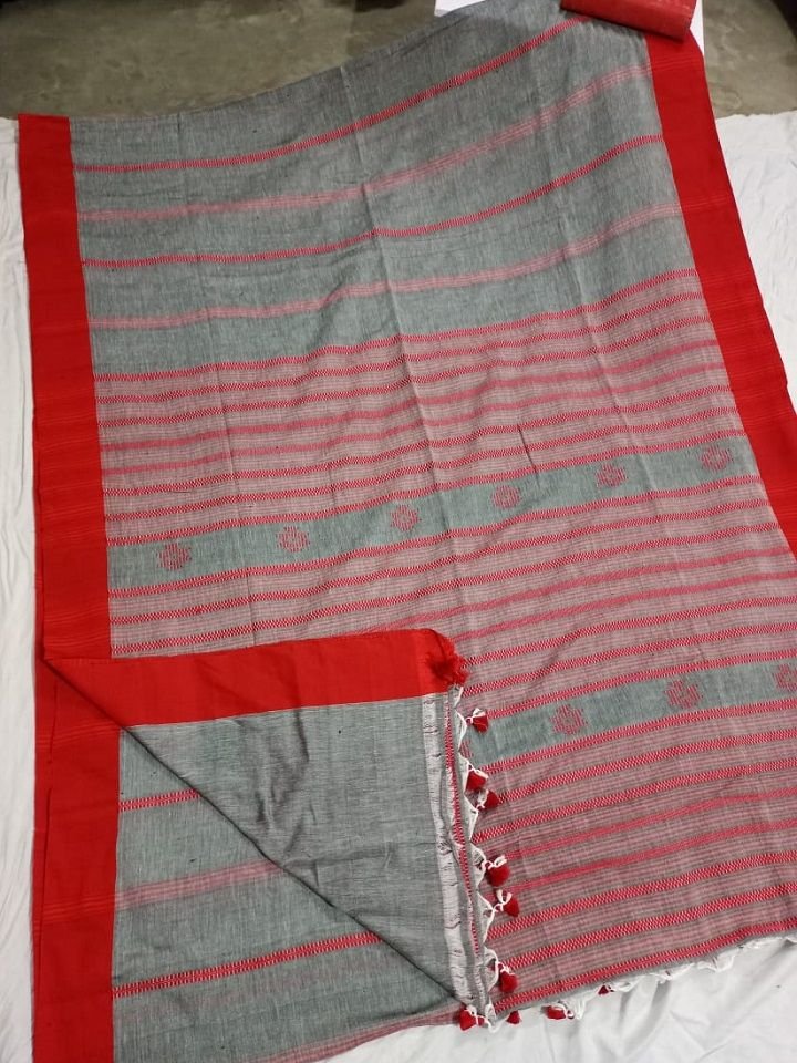 Awesome Grey Red Cotton Dobby Katha Jamdani Handwoven Saree