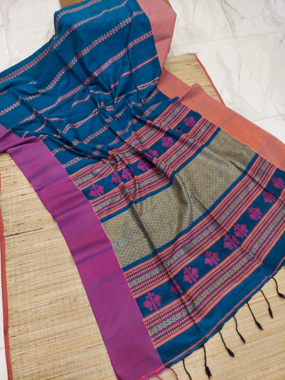 Blue Pink Orange Fusion Designer Stripe Pattern Cotton Handwoven Saree