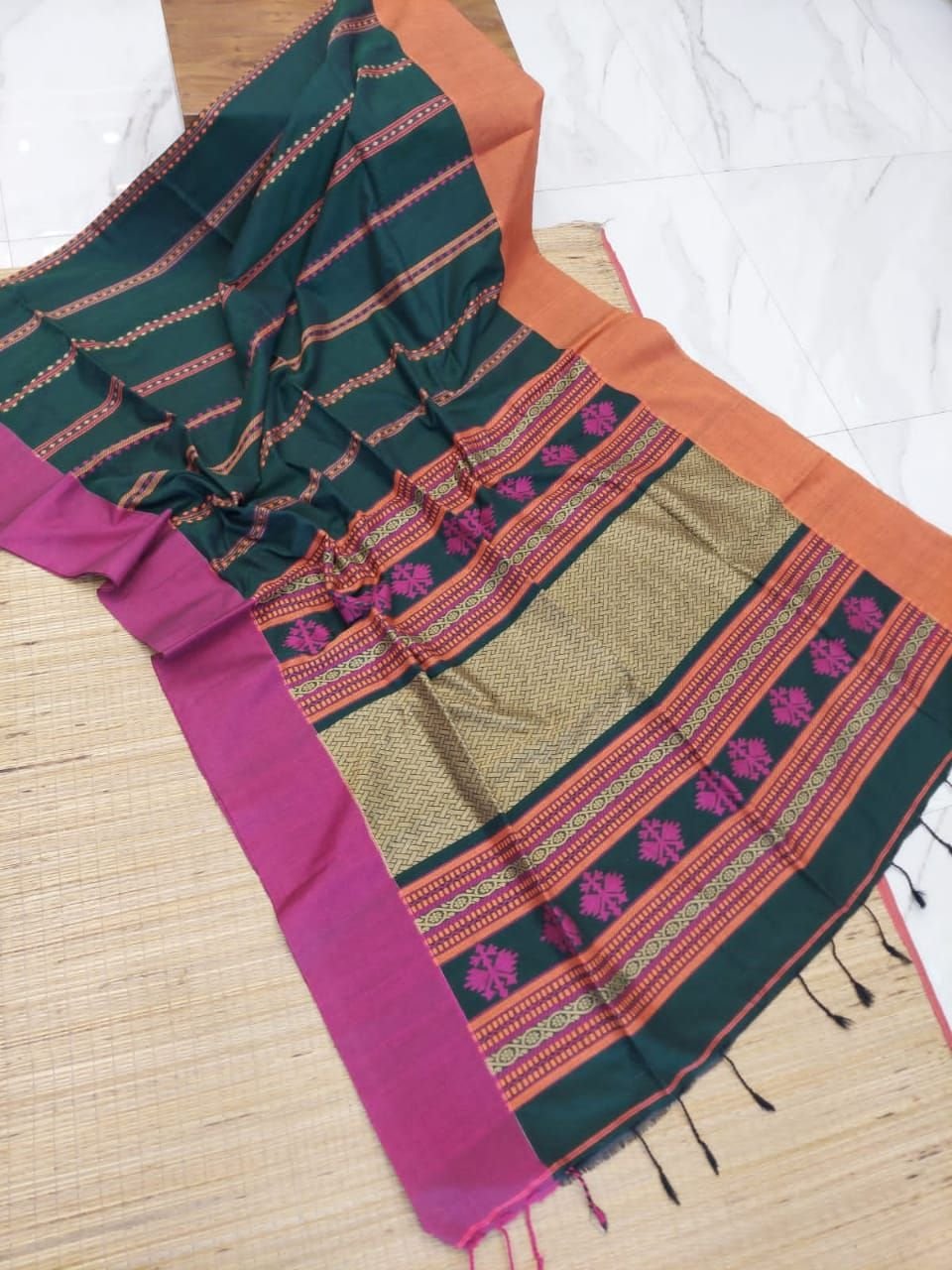 Bottle Green Designer Stripe Pattern Cotton Handwoven Saree With Rich Design Pallu