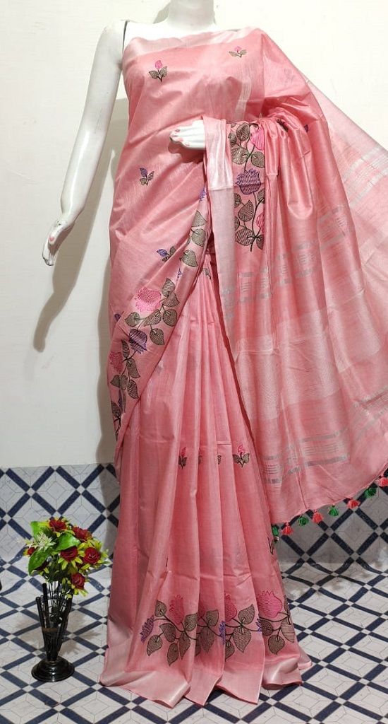 This stunning saree features a calming shade of peach pink that is sure to make you stand out. The intricate floral embroidery on the saree is done in shades of gold, green, and pink, creating a beautiful contrast against the peach pink fabric. Made from high-quality linen, this saree is lightweight, breathable, and comfortable to wear throughout the day. The generous length of the saree allows for versatile draping styles, and the embroidery adds a touch of elegance and sophistication to the overall look. This saree is perfect for formal occasions such as weddings or festivals, and can be paired with traditional gold jewelry and a sleek hairstyle to complete the look. Overall, the Calming Peach Pink Floral Embroidery Linen Saree is a perfect blend of traditional and modern styles, making it a great addition to any wardrobe.