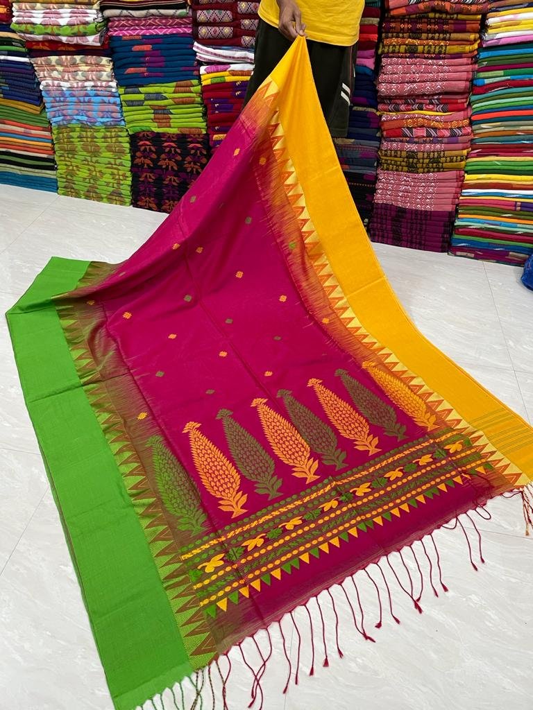 Charming Dark Pink Pure Cotton Handwoven Saree With Contrast Temple Border