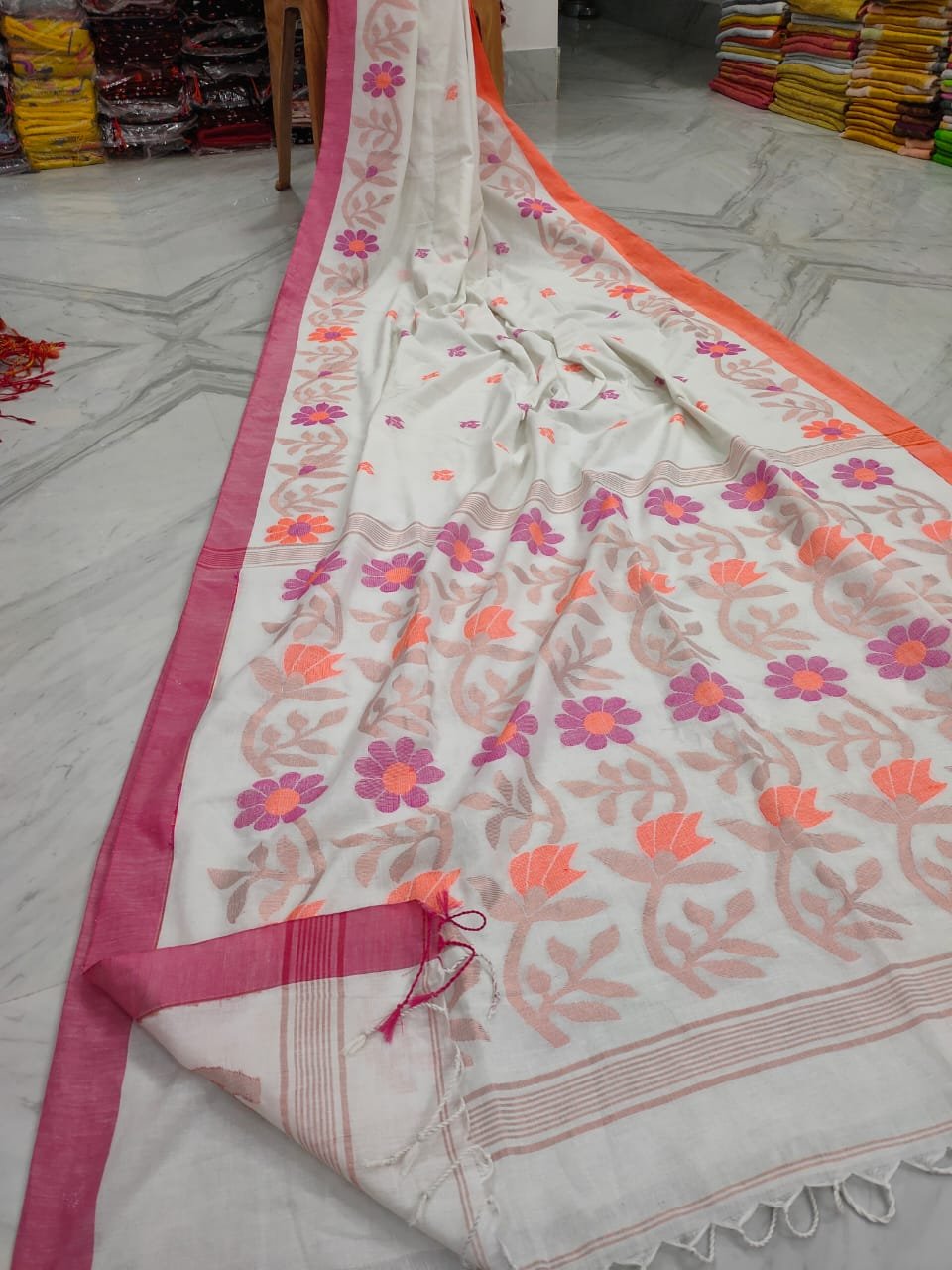 Compassionate White Floral Design Handwoven Pure Cotton Saree