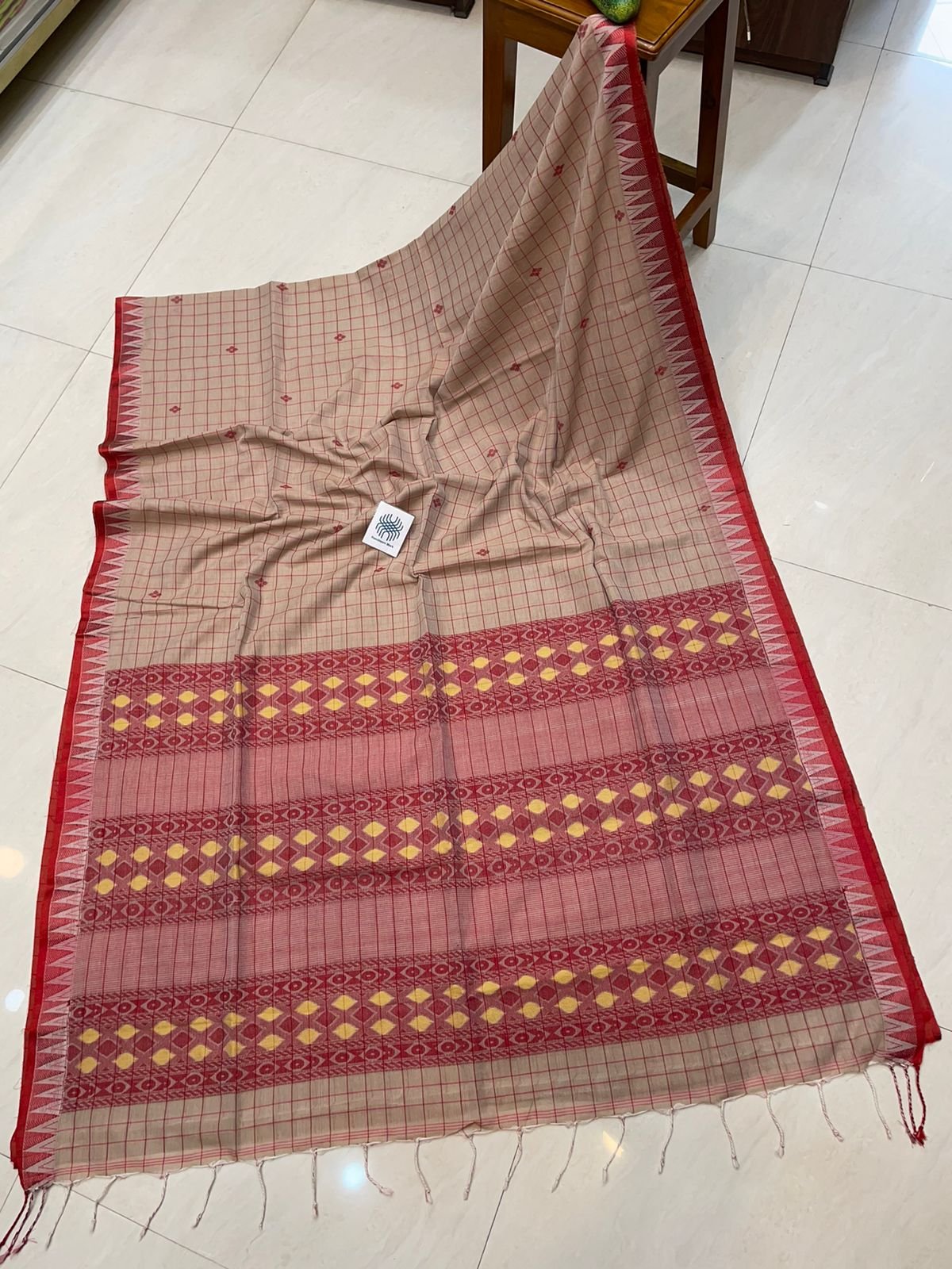 Cream Red Check Temple Border Premium Handloom Cotton Saree