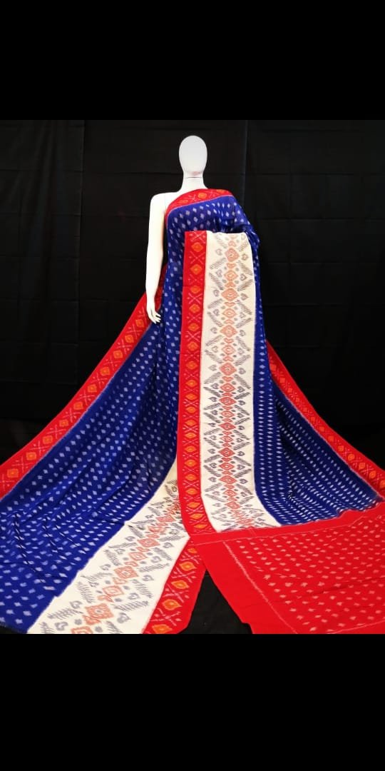 Dark Blue Pochampally Ikkat Cotton Handwoven Saree with Red White Big Border