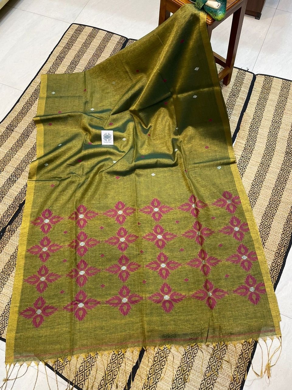 Green Golden Tissue Linen Pink Floral Jamdani Handloom Saree
