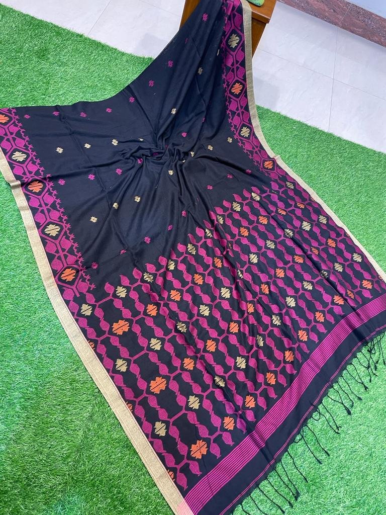 Impressive Black Pure Cotton Minakari Jamdani Handwoven Saree