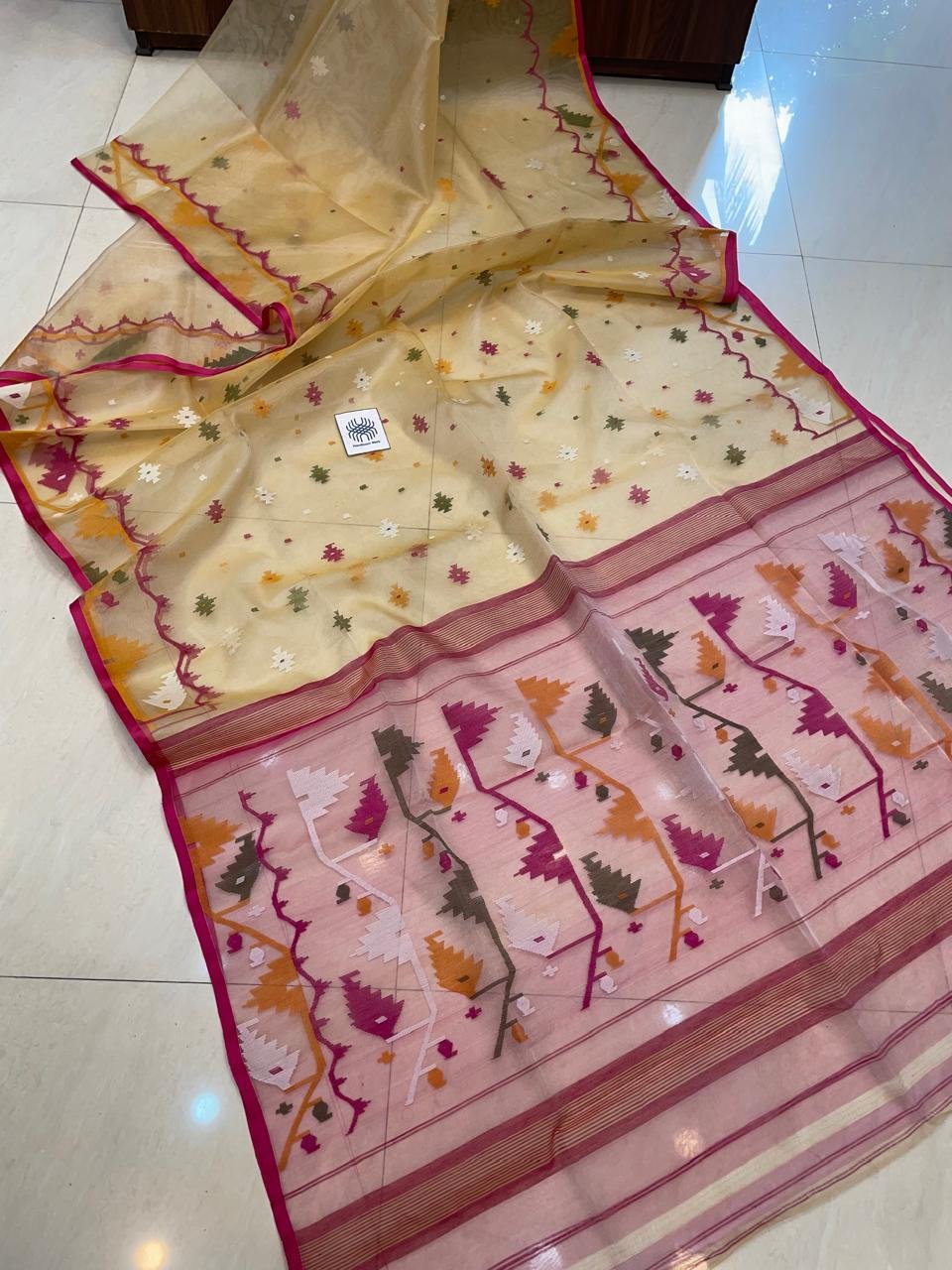 Light Yellow Red Pure Handwoven Muslin Jamdani Without Blouse Piece