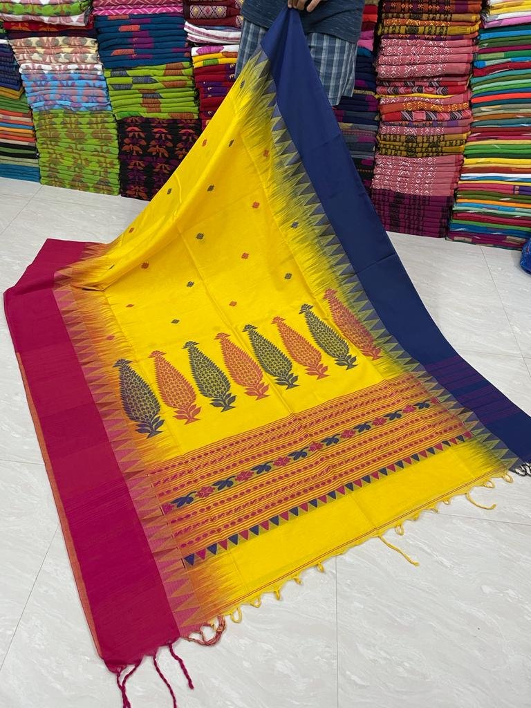 Lovely Yellow Pure Cotton Handwoven Saree With Contrast Temple Border
