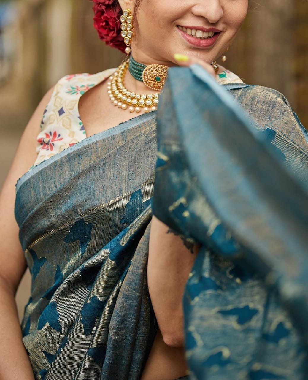 Give in to the temptation of Matka silk and look fabulous always! Draped in this beautiful teal blue butterfly weave saree, you are sure to be appreciated for your fine tastes. Trendy yet elegant, this blue-shaded saree is a must-have. Made with Matka silk and integrated with a Butterfly weave pattern, the saree comes along with a running blouse piece. The serene and graceful appeal will inspire you to wear it with complete confidence and flaunt your aura among people. Order this exquisite attire now.
