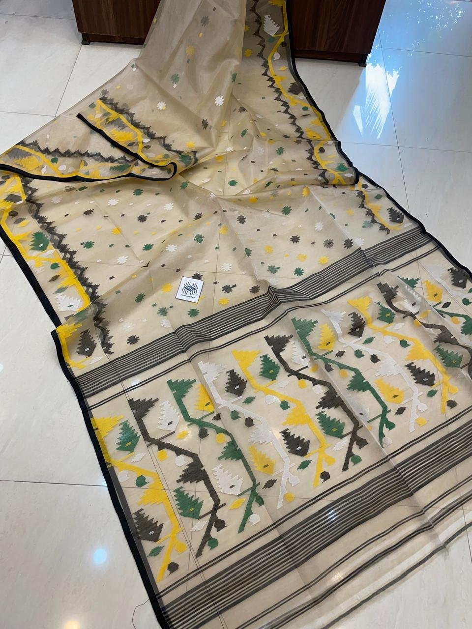 OffWhite Black Pure Handwoven Muslin Jamdani Without Blouse Piece