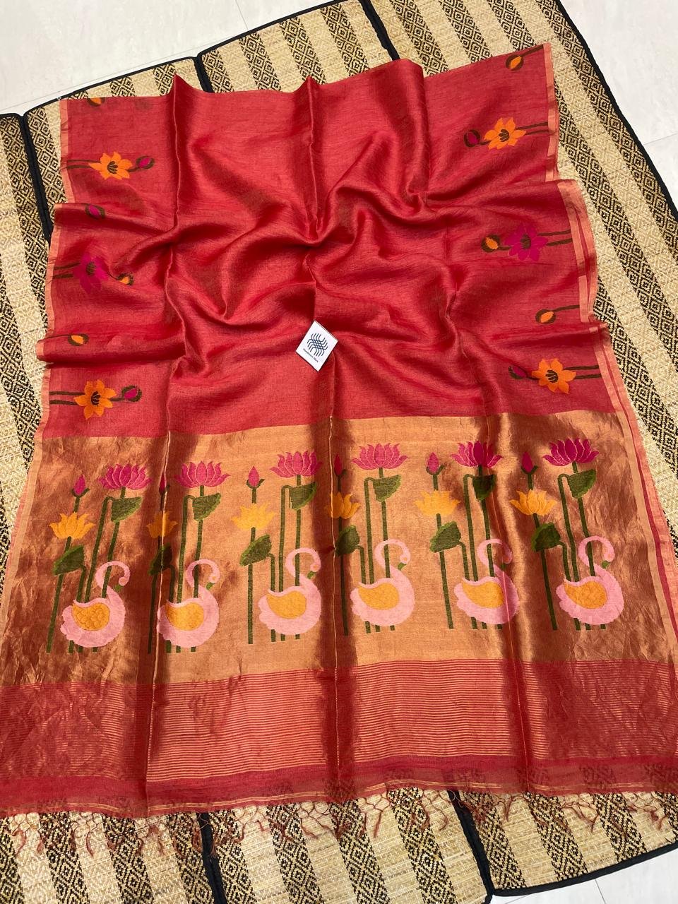 Peach Red Premium Quality Tissue Linen Saree With Paithani Pallu