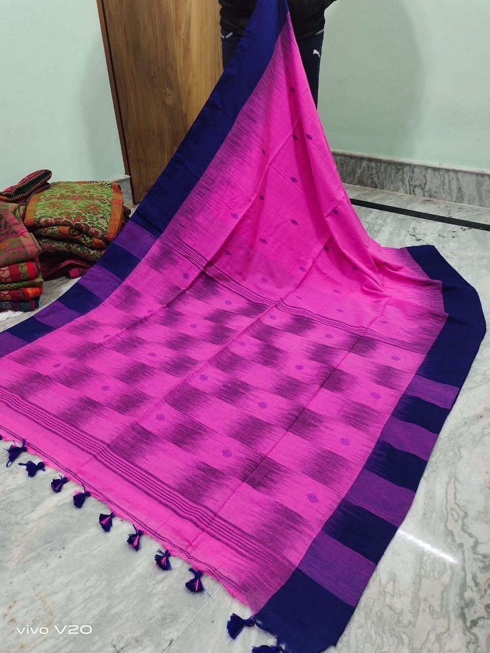 This is a beautiful traditional Indian saree made from high-quality pure cotton fabric that features a stunning ikkat weave. The saree is handloomed using the ikkat technique, which involves binding and dyeing the threads before weaving, creating unique and intricate patterns