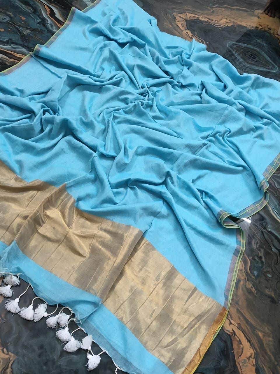 Sky Blue Soft Mul Cotton Saree With Thin Borders