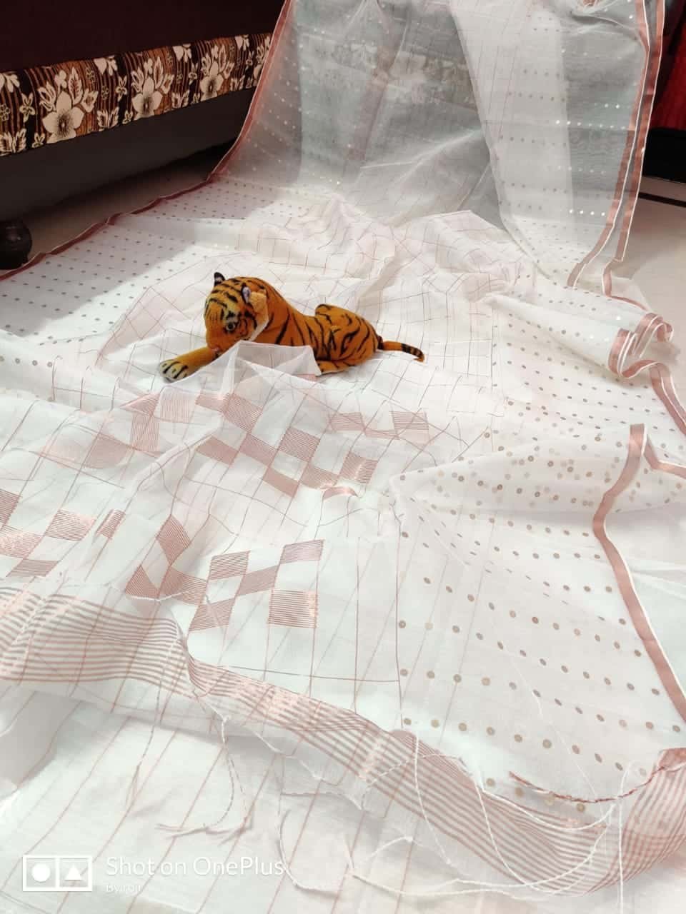 This stunning saree is handwoven using pure resham muslin silk fabric in a beautiful snowy white shade. The saree is adorned with intricate sequins work that adds a touch of elegance and glamour to the overall look. The resham muslin fabric gives the saree a soft and delicate texture that is perfect for formal occasions.