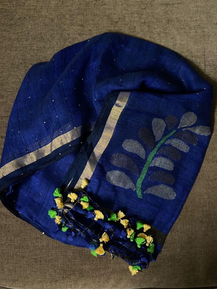 Strikingly Beautiful Dark Navy Blue Handwoven Linen Sequin Saree