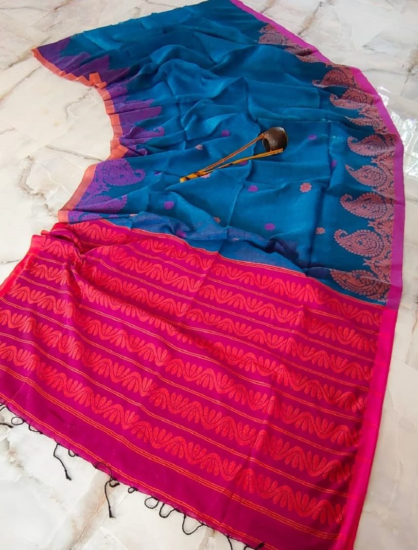 Unique Blue Pink Orange Fusion Linen Saree With Mango Design Border