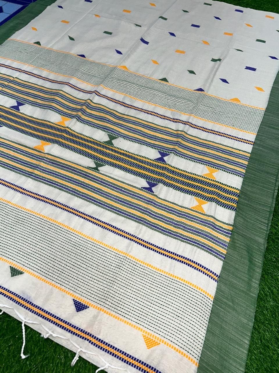 White Green Cotton Four Ply Jamdani Handloom Saree