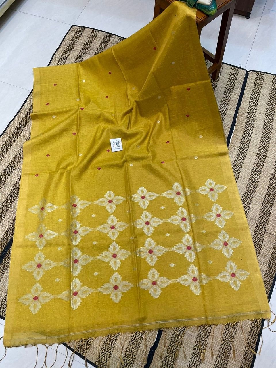 Yellow Golden Tissue Linen Floral Jamdani Handloom Saree